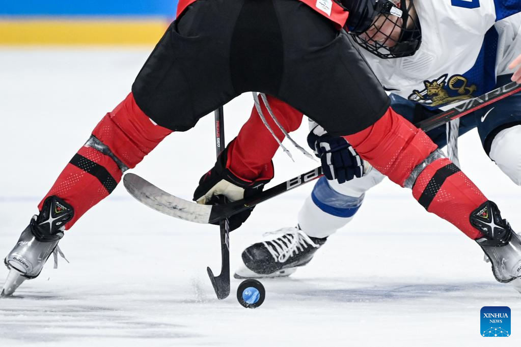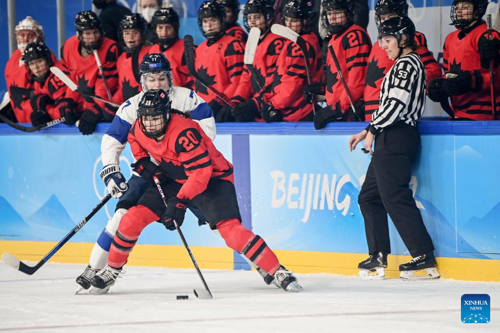 Athletes fight over the control of the puck during the ice hockey women's preliminary round group A match between Canada and Finland at Wukesong Sports Centre in Beijing, capital of China, Feb. 5, 2022. (Xinhua/Ma Ning)