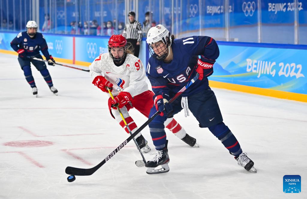 (220206) -- BEIJING, Feb. 5, 2022 (Xinhua) -- Abby Roque (1st R) of the United States tries to control the puck during the women's ice hockey preliminary round Group A match between the United States and the Russian Olympic Committee at Wukesong Sports Centre in Beijing, capital of China, Feb. 5, 2022. (Xinhua/Song Yanhua)