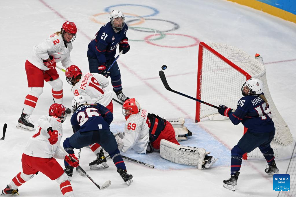 Savannah Harmon (1st R) of the United States shoots the gate during the women's ice hockey preliminary round Group A match between the United States and the Russian Olympic Committee at Wukesong Sports Centre in Beijing, capital of China, Feb. 5, 2022. (Xinhua/Huang Zongzhi)