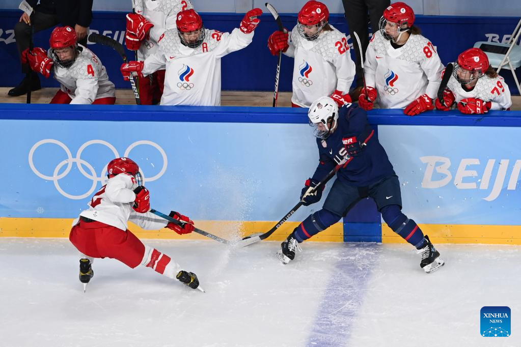Oxana Bratisheva (L) of the Russian Olympic Committee vies with Cayla Barnes of the United States during the women's ice hockey preliminary round Group A match between the United States and the Russian Olympic Committee at Wukesong Sports Centre in Beijing, capital of China, Feb. 5, 2022. (Xinhua/Huang Zongzhi)