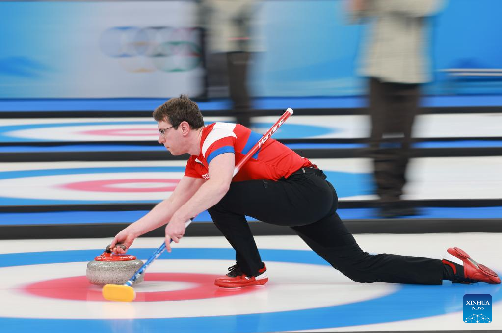 Tomas Paul of the Czech Republic competes during the curling mixed doubles round robin session of the Beijing 2022 Winter Olympics between Czech Republic and Norway at the National Aquatics center in Beijing, China, Feb. 5, 2022. (Xinhua/Liu Xu)