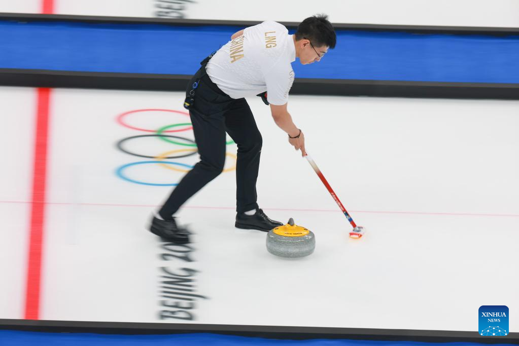 Ling Zhi of China competes during the curling mixed doubles round robin session of the Beijing 2022 Winter Olympics between China and Norway at the National Aquatics center in Beijing, China, Feb. 5, 2022. (Xinhua/Liu Xu)