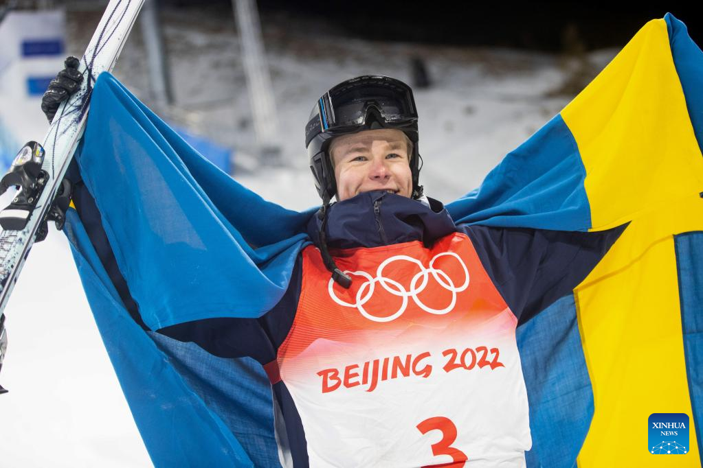 Walter Wallberg of Sweden celebrates after Free Style Skiing Men's Moguls Final at Genting Snow Park in Zhangjiakou, north China's Hebei Province, Feb. 5, 2022. (Xinhua/Wu Zhuang)