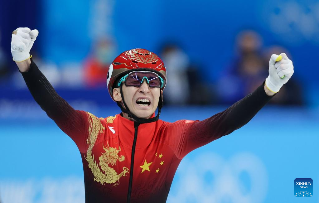 Wu Dajing of China celebrates victory of the mixed team relay final of short track speed skating at the Capital Indoor Stadium in Beijing, China, Feb. 5, 2022. (Xinhua/Cao Can)