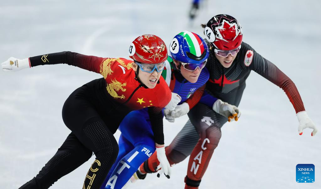 Fan Kexin (1st L) of China competes during the mixed team relay final of short track speed skating at the Capital Indoor Stadium in Beijing, China, Feb. 5, 2022. (Xinhua/Lan Hongguang)