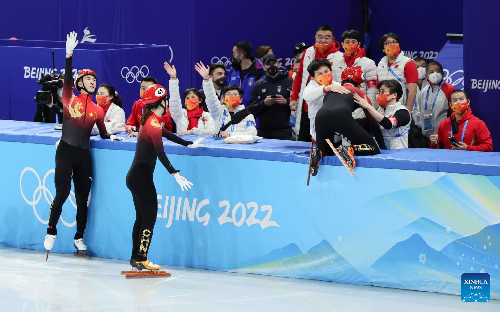 Athletes and staff members of China celebrate after the mixed team relay final of short track speed skating at Capital Indoor Stadium in Beijing, China, Feb. 5, 2022. (Xinhua/Lan Hongguang)