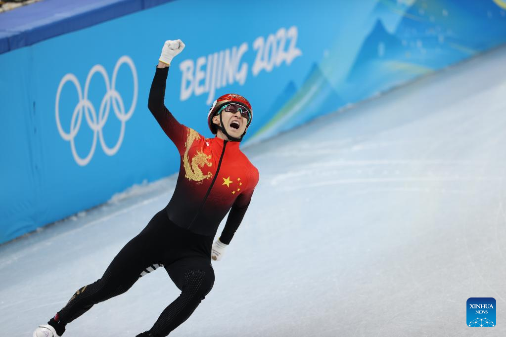 Wu Dajing of China celebrates victory of the mixed team relay final of short track speed skating at the Capital Indoor Stadium in Beijing, China, Feb. 5, 2022. (Xinhua/Yang Lei)