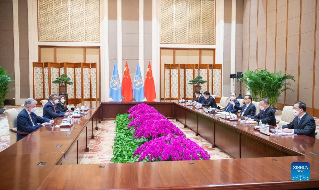 Chinese Premier Li Keqiang meets with visiting Director-General of the World Health Organization (WHO) Tedros Adhanom Ghebreyesus, who came to China for the opening ceremony of the Beijing 2022 Olympic Winter Games, at the Diaoyutai State Guesthouse in Beijing, capital of China, Feb. 5, 2022. (Xinhua/Li Tao)