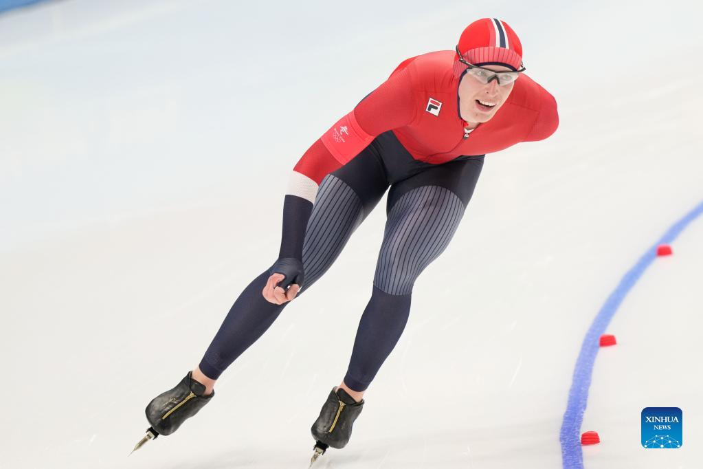 Hallgeir Engebraaten of Norway competes during the men's 5,000m final of speed skating at the National Speed Skating Oval in Beijing, capital of China, Feb. 6, 2022. (Xinhua/Du Yu)