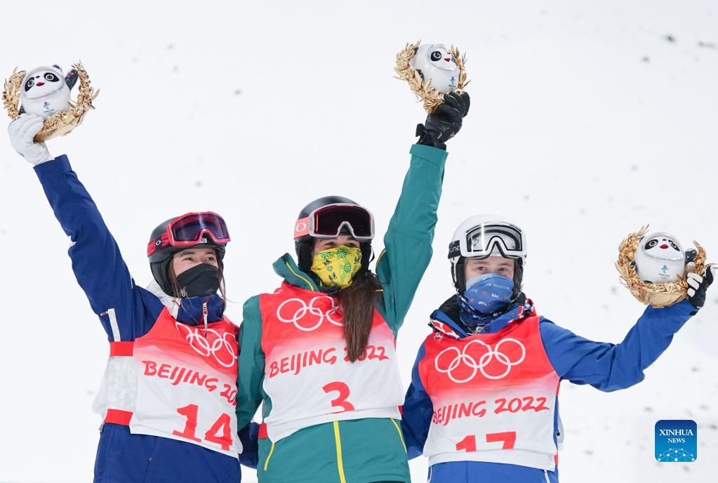 Jakara Anthony (C) of Australia, Jaelin Kauf (L) of the United States and Anastasiia Smirnova of ROC attend the flower ceremony after the freestyle skiing women's moguls final at the Genting Snow Park in Zhangjiakou, north China's Hebei Province, Feb. 6, 2022. (Xinhua/Yang Shiyao)