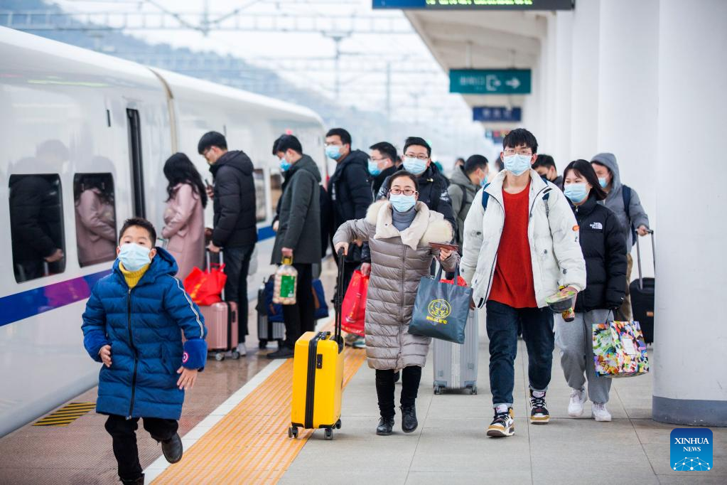 Passengers board a train in Duchang Railway Station in Duchang County, east China's Jiangxi Province, Feb. 6, 2022.