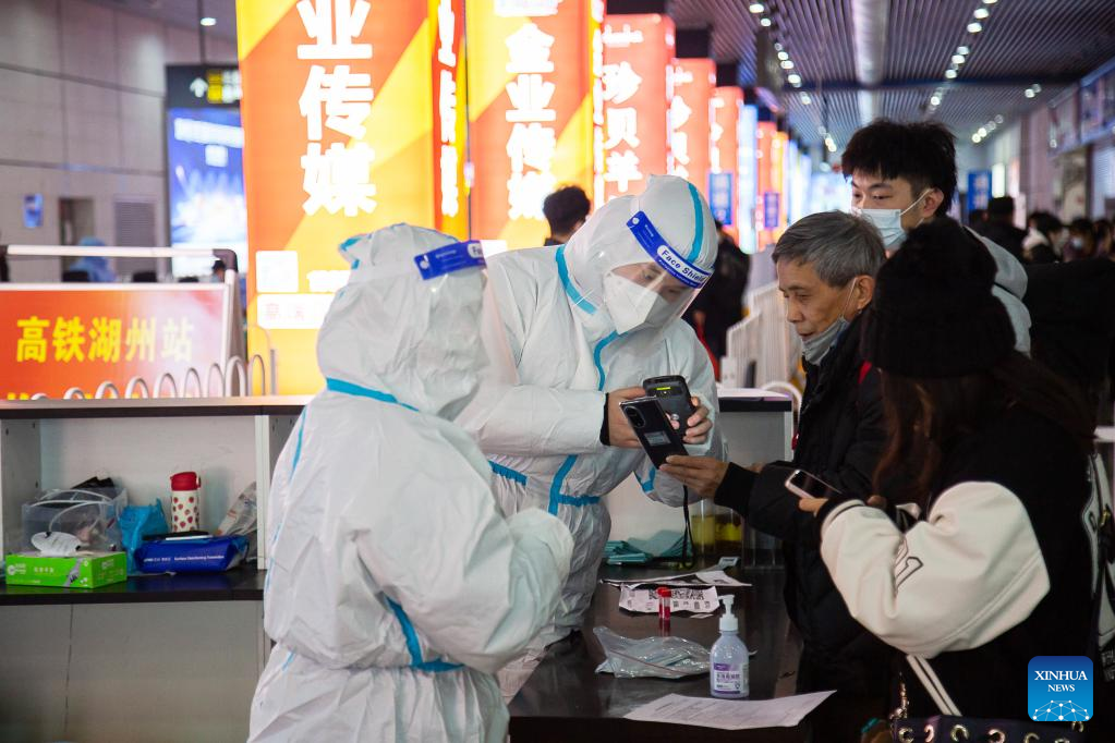 Passengers register for COVID-19 nucleic acid tests in Huzhou Railway Station in Huzhou City, east China's Zhejiang Province, Feb. 6, 2022.