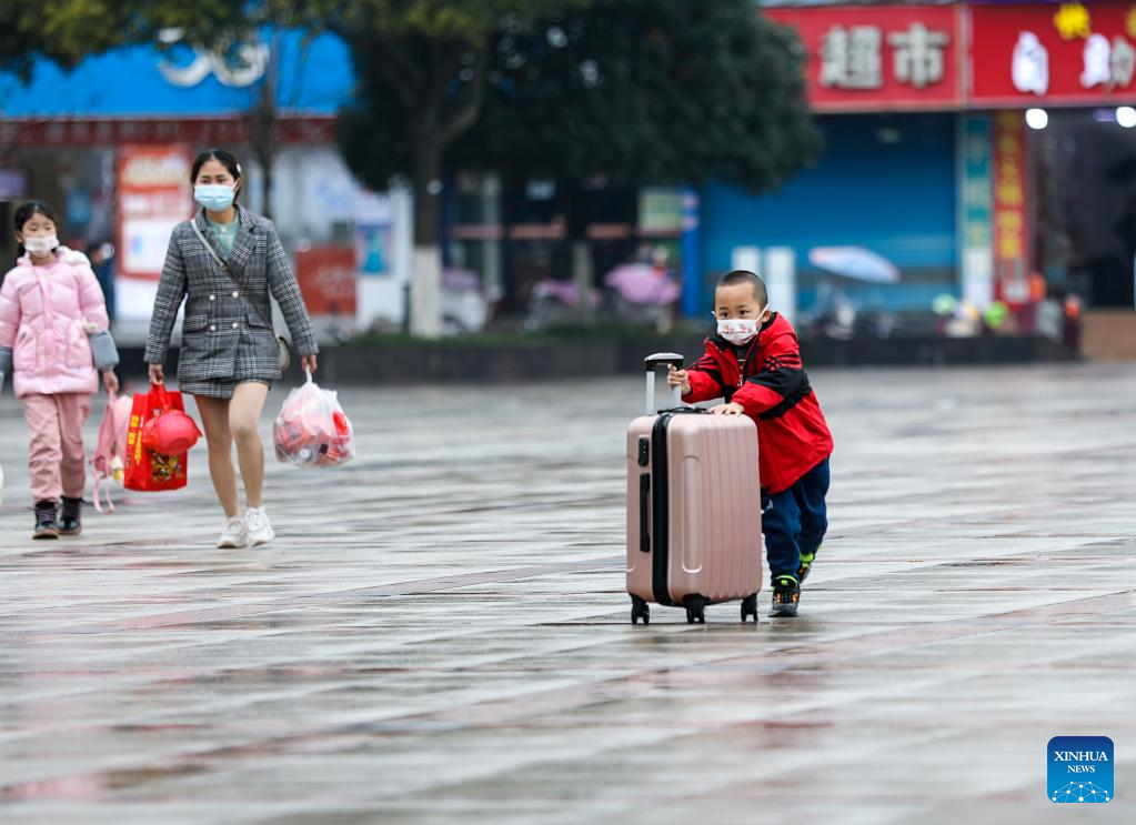 Passengers walk to Hengyang Railway Station in Hengyang City, central China's Hunan Province, Feb. 6, 2022.