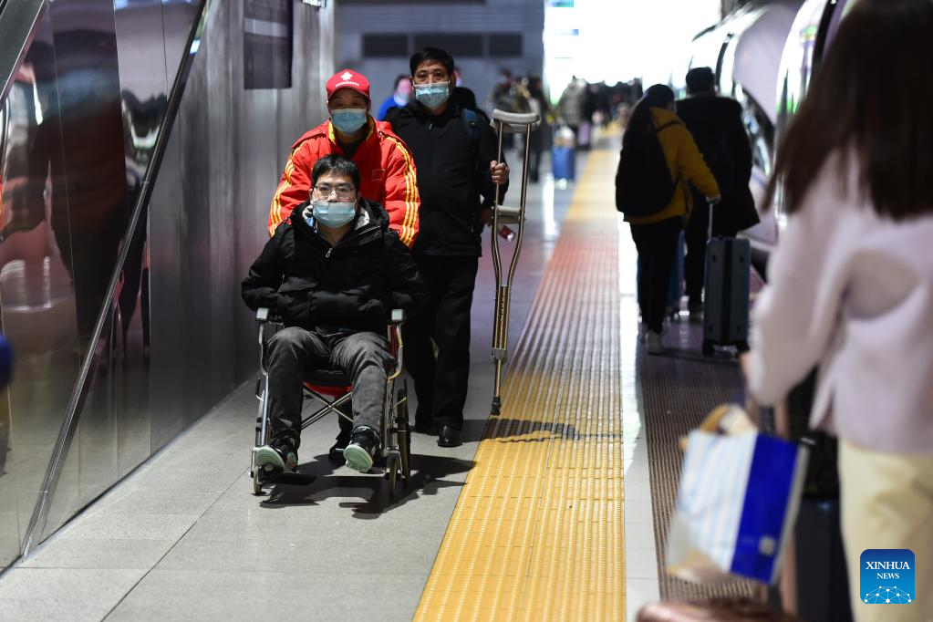 A volunteer helps a passenger in a wheelchair board a train in Hefei South Railway Station in Hefei, east China's Anhui Province, Feb. 6, 2022.