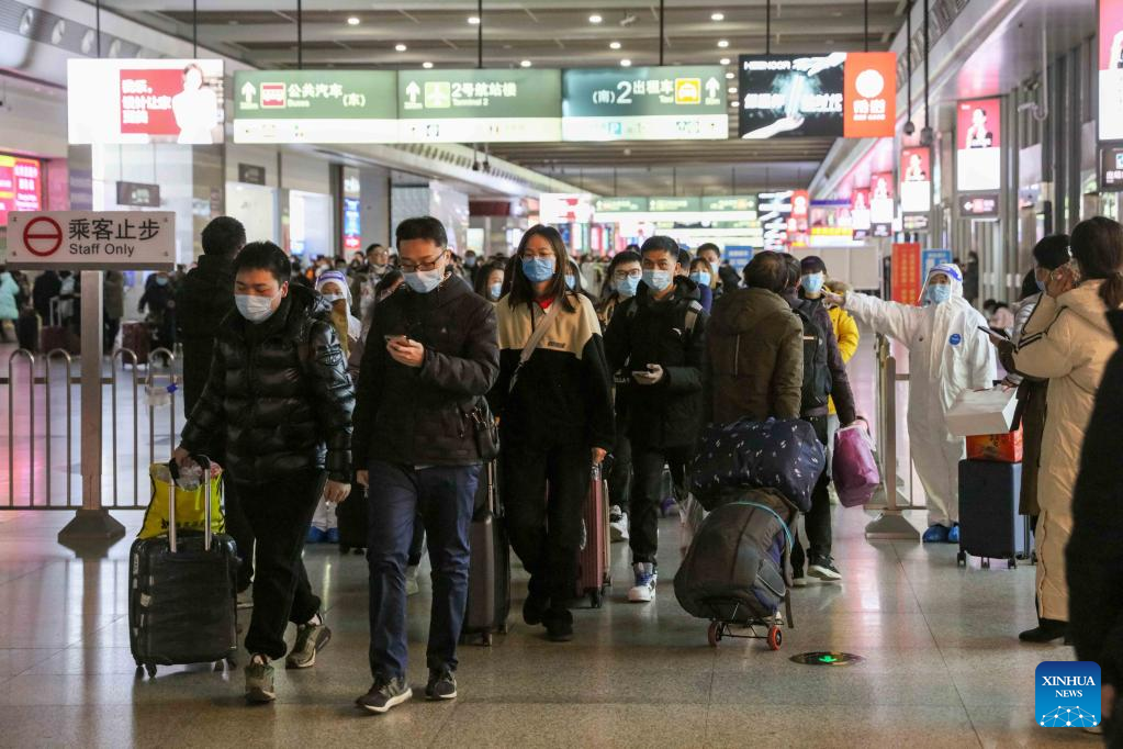 Passengers walk in Shanghai Hongqiao Railway Station in east China's Shanghai, Feb. 6, 2022.