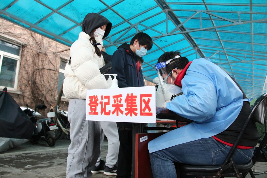 Volunteers register for residents waiting for nucleic acid test at a COVID-19 testing site in Beijing, Jan. 23, 2022. (Xinhua/Tang Rufeng)