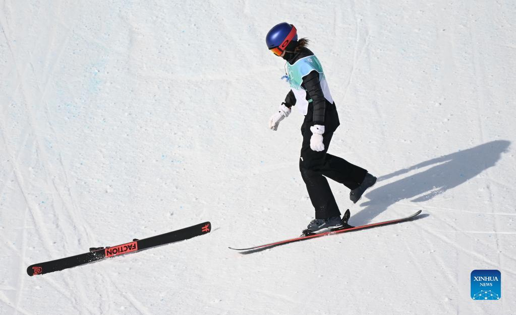 Gu Ailing of China reacts during the women's freeski big air qualification at Big Air Shougang in Beijing, capital of China, Feb. 7, 2022. (Xinhua/Xiong Qi)