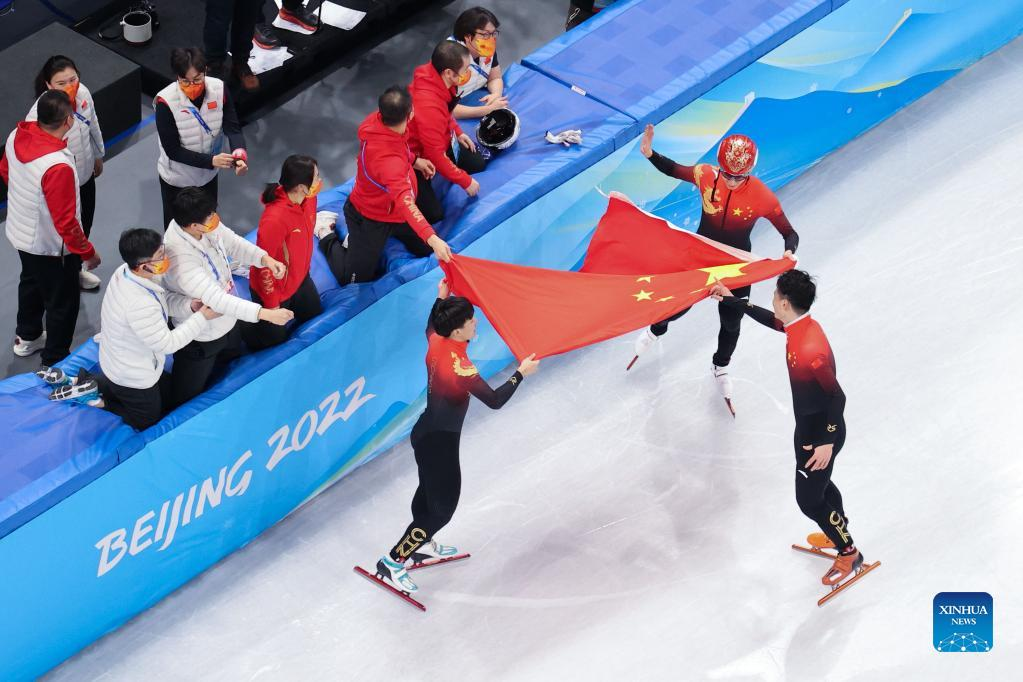 Li Wenlong (L), Wu Dajing (C) and Ren Ziwei (R) of China celebrate after the men's 1,000m final of short track speed skating at Capital Indoor Stadium in Beijing, capital of China, Feb. 7, 2022. (Xinhua/Xu Zijian)