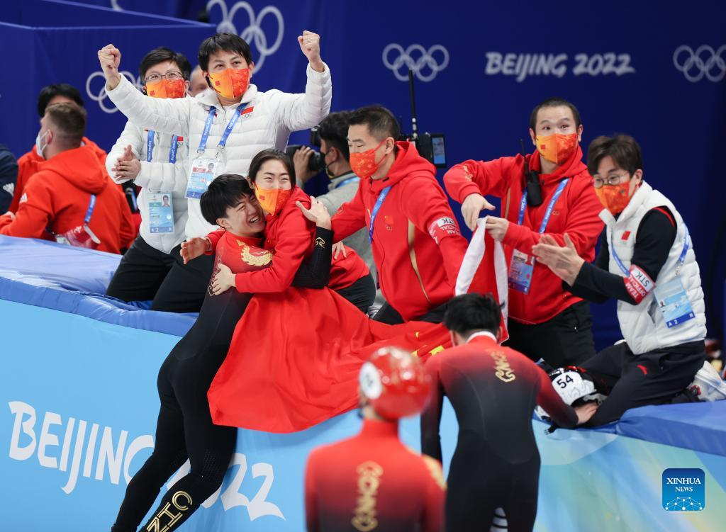 Members of Chinese team celebrate after the men's 1000m final of short track speed skating at Capital Indoor Stadium in Beijing, capital of China, Feb. 7, 2022. (Xinhua/Yang Lei)