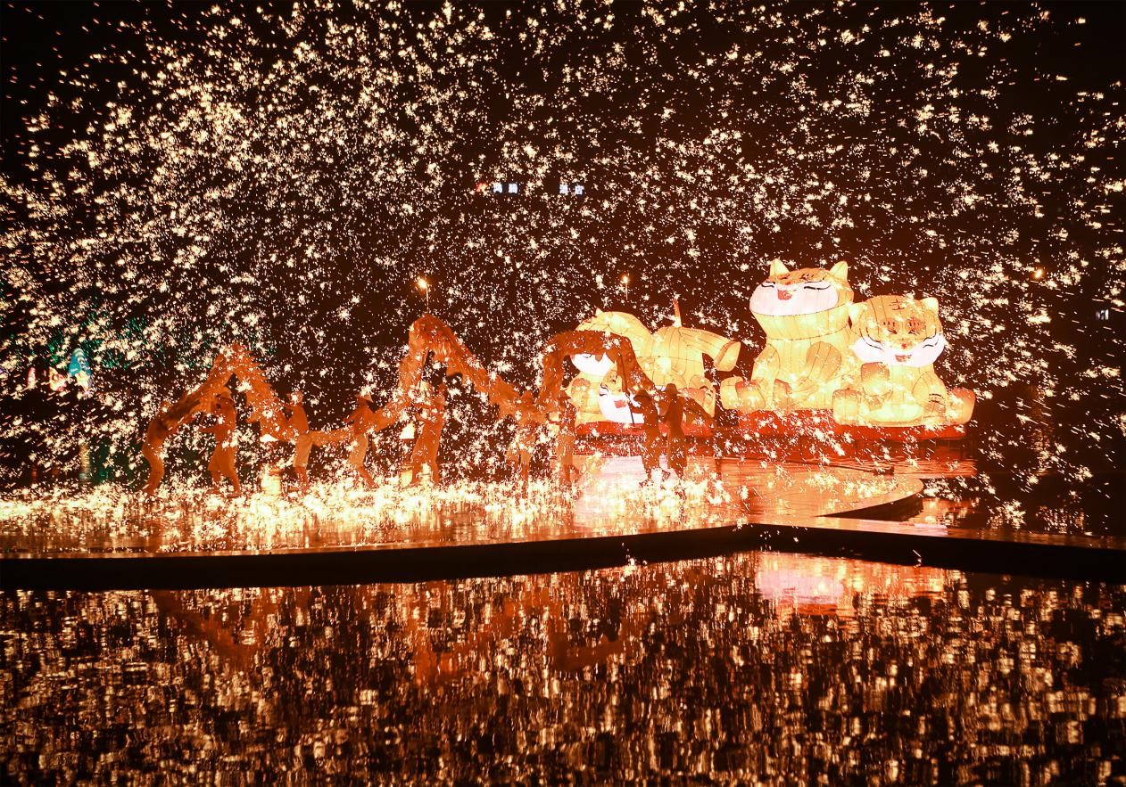 Photo taken on the evening of Feb. 5, 2022 shows performances of folk art Datiehua and fire dragon dance in a park in Wenjiang district, Chengdu city, capital of southwest China’s Sichuan province. (People’s Daily Online/Ai Jiaxian)
