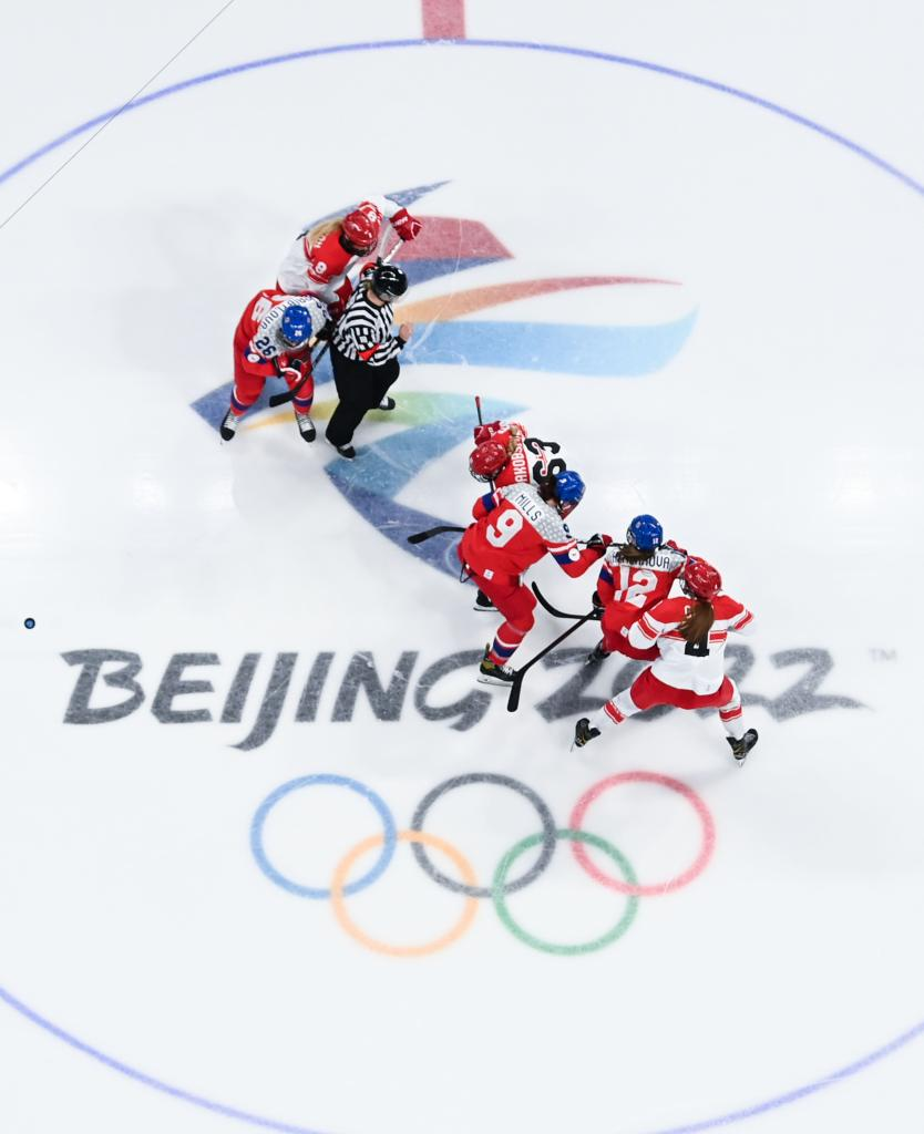 Athletes compete during the kick-off of the ice hockey women's Group B match between Denmark and Czech Republic at Wukesong Sports Centre in Beijing, capital of China, Feb. 7, 2022. (Xinhua/Meng Yongmin)
