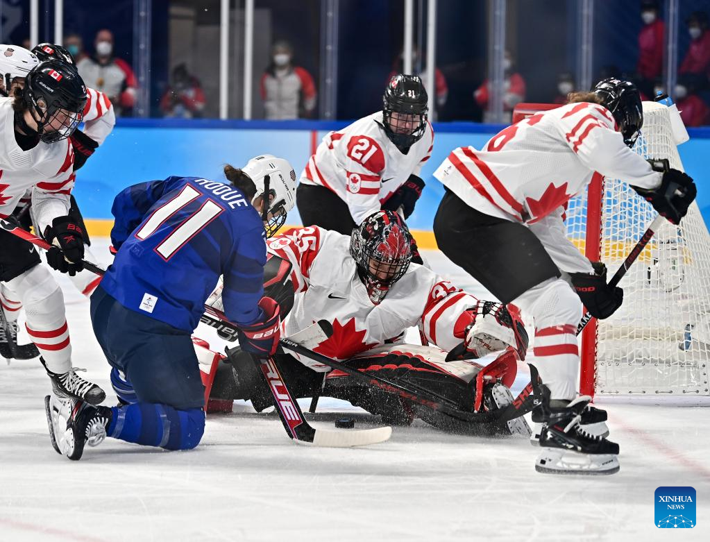 Ann-Renee Desbiens (2nd L) of Canada guards the gate during the ice hockey women's preliminary round group A match between Canada and the United States at Wukesong Sports Centre in Beijing, capital of China, Feb. 8, 2022. (Xinhua/Li An)