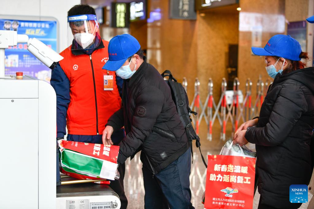 Migrant workers wait for security check at Zunyi Station in Zunyi, southwest China's Guizhou Province, Feb. 8, 2022. A special train free of charge for migrant workers who are about to return to work left Zunyi Station in Guizhou Province on Tuesday for Guangzhou and Zhuhai in east China's Guangdong Province. It is the first such train for returning workers in Guizhou this year. More than 600 migrant workers here took the train. (Xinhua/Yang Wenbin)