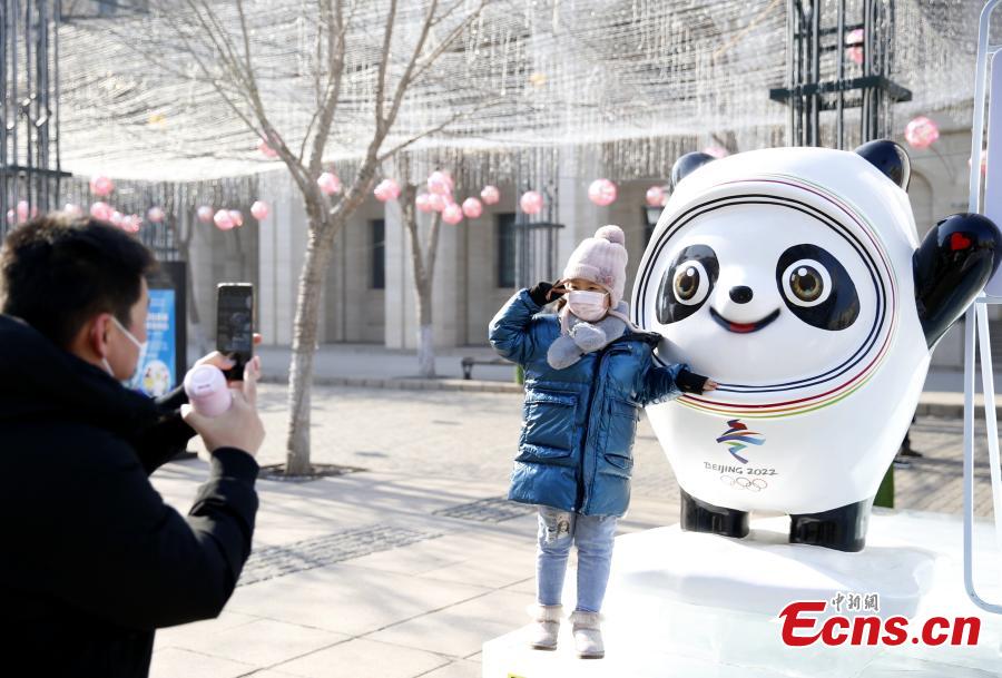 Local citizens and tourists take photos with the Beijing 2022 Winter Olympics mascot Bing Dwen Dwen in Harbin, northeast China's Heilongjiang Province, Feb. 8, 2022. (Photo: China News Service/Jiang Hui)