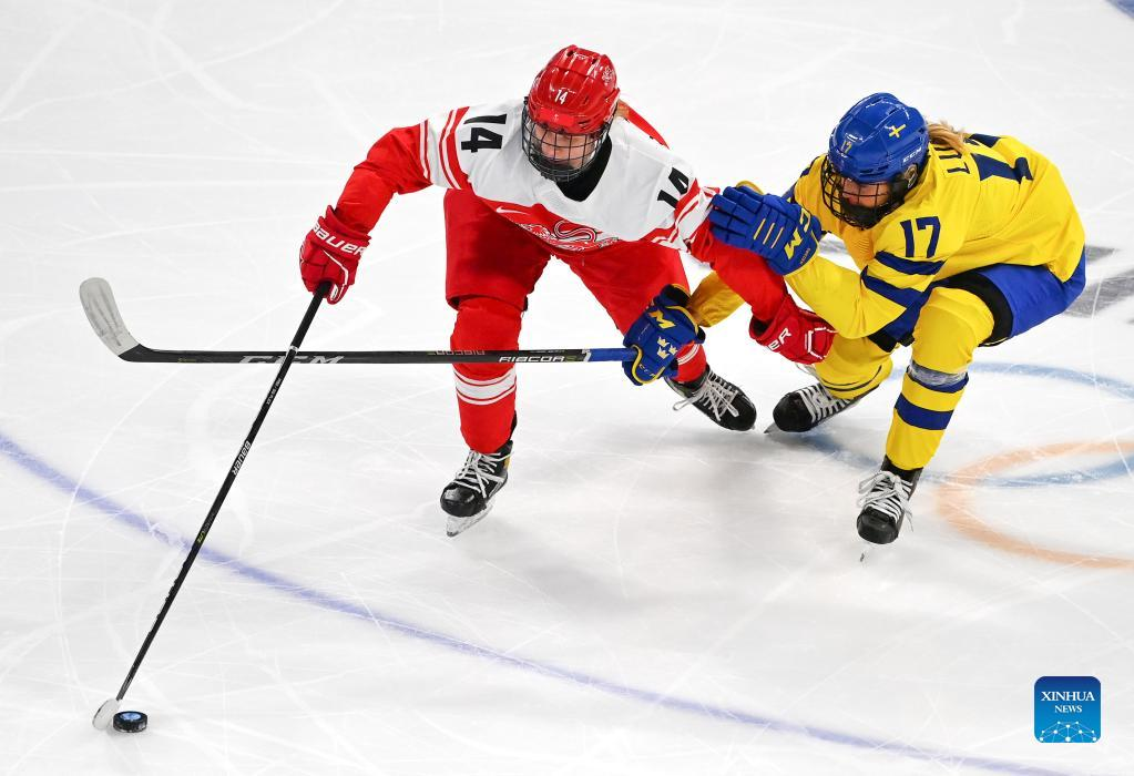 Silke Glud (C) of Denmark competes during the ice hockey women's preliminary round group B match between Sweden and Denmark at Wukesong Sports Centre in Beijing, capital of China, Feb. 8, 2022. (Xinhua/Li Ran)