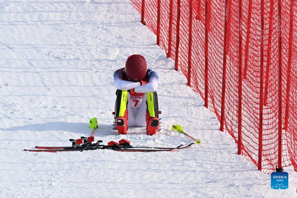 Mikaela Shiffrin of the United States reacts during the alpine skiing women's slalom at the National Alpine Skiing Centre in Yanqing District, Beijing, capital of China, Feb. 8, 2022. (Xinhua/Zhang Chenlin)