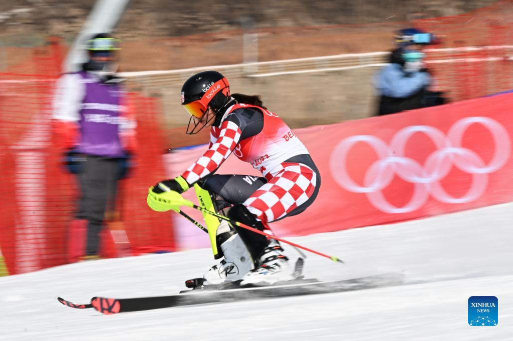 Zrinka Ljutic of Croatia competes during alpine skiing women's slalom of the Beijing 2022 Winter Olympics at the National Alpine Skiing Centre in Yanqing District, Beijing, capital of China, Feb. 8, 2022. (Xinhua/Zhang Chenlin)