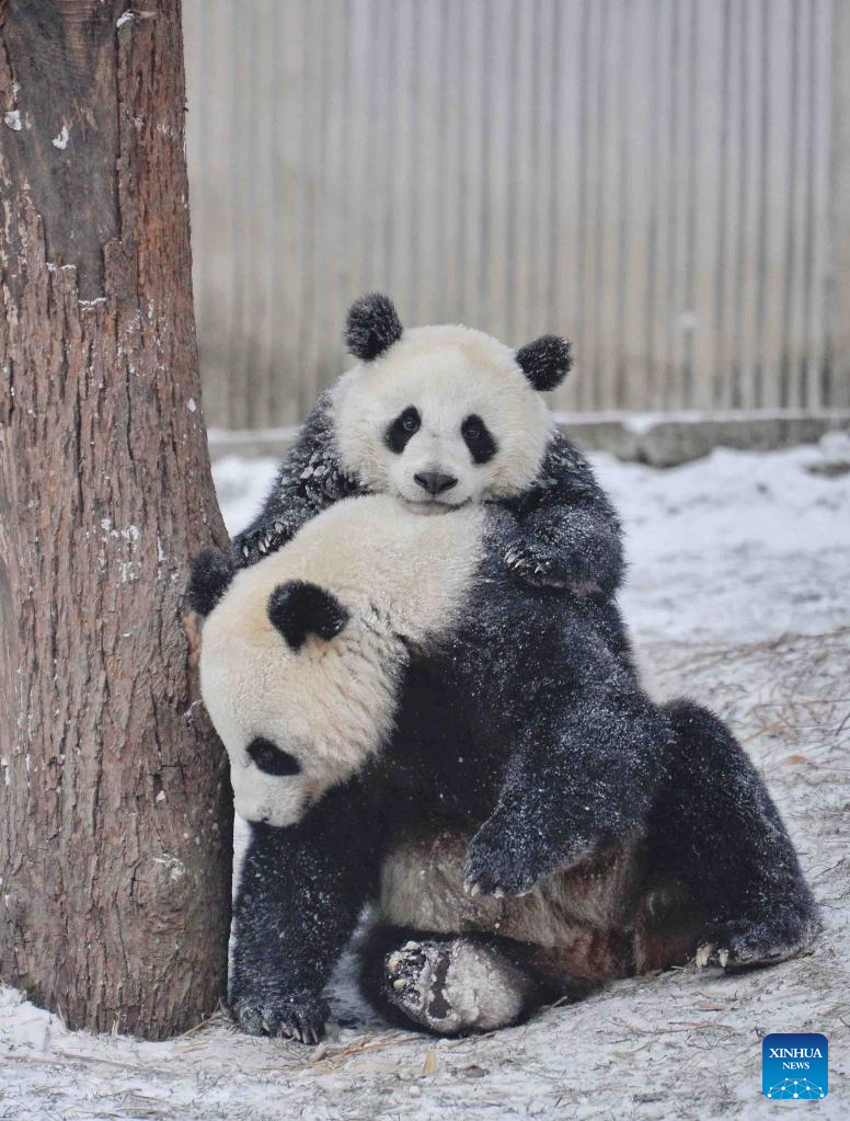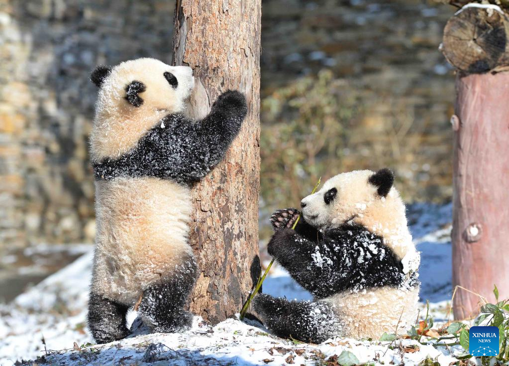 Giant pandas play at the snow-covered Shenshuping base of the China Conservation and Research Center for Giant Panda in Wolong, southwest China's Sichuan Province, Feb. 9, 2022. (Xinhua/Liu Kun)