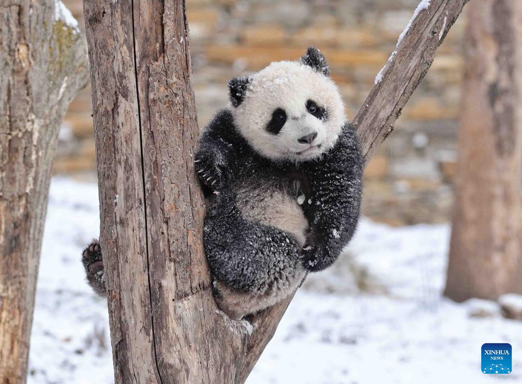 A giant panda plays in a tree at the snow-covered Shenshuping base of the China Conservation and Research Center for Giant Panda in Wolong, southwest China's Sichuan Province, Feb. 9, 2022. (Xinhua/Liu Kun)