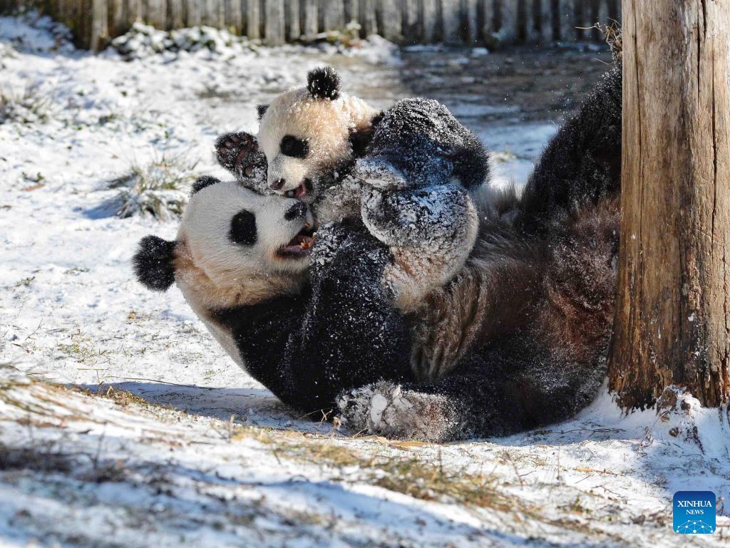 A giant panda plays with its cub at the snow-covered Shenshuping base of the China Conservation and Research Center for Giant Panda in Wolong, southwest China's Sichuan Province, Feb. 9, 2022. (Xinhua/Liu Kun)