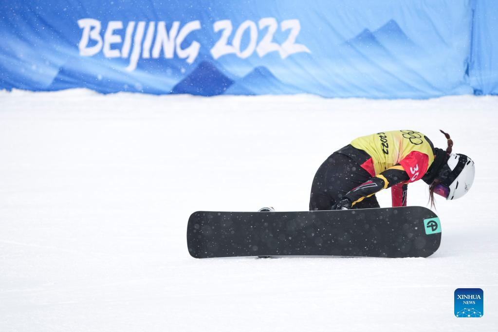 Feng He of China reacts during women's snowboard cross 1/8 finals of the Beijing 2022 Winter Olympics at Genting Snow Park in Zhangjiakou, north China's Hebei Province, Feb. 9, 2022. (Xinhua/Wang Haofei)