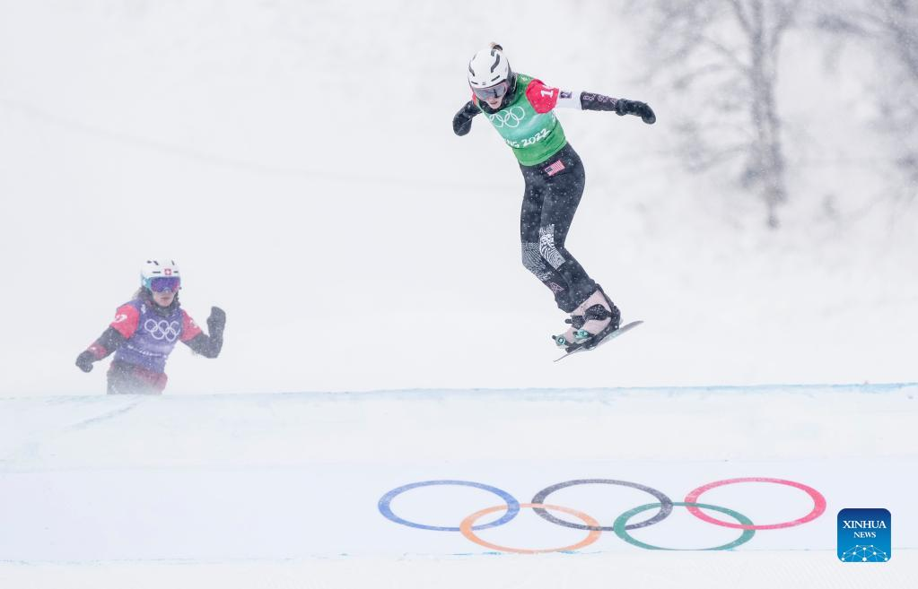 Meghan Tierney of the United States (R) and Lara Casanova of Switerland compete during women's snowboard cross 1/8 finals of the Beijing 2022 Winter Olympics at Genting Snow Park in Zhangjiakou, north China's Hebei Province, Feb. 9, 2022. (Xinhua/Wang Haofei)