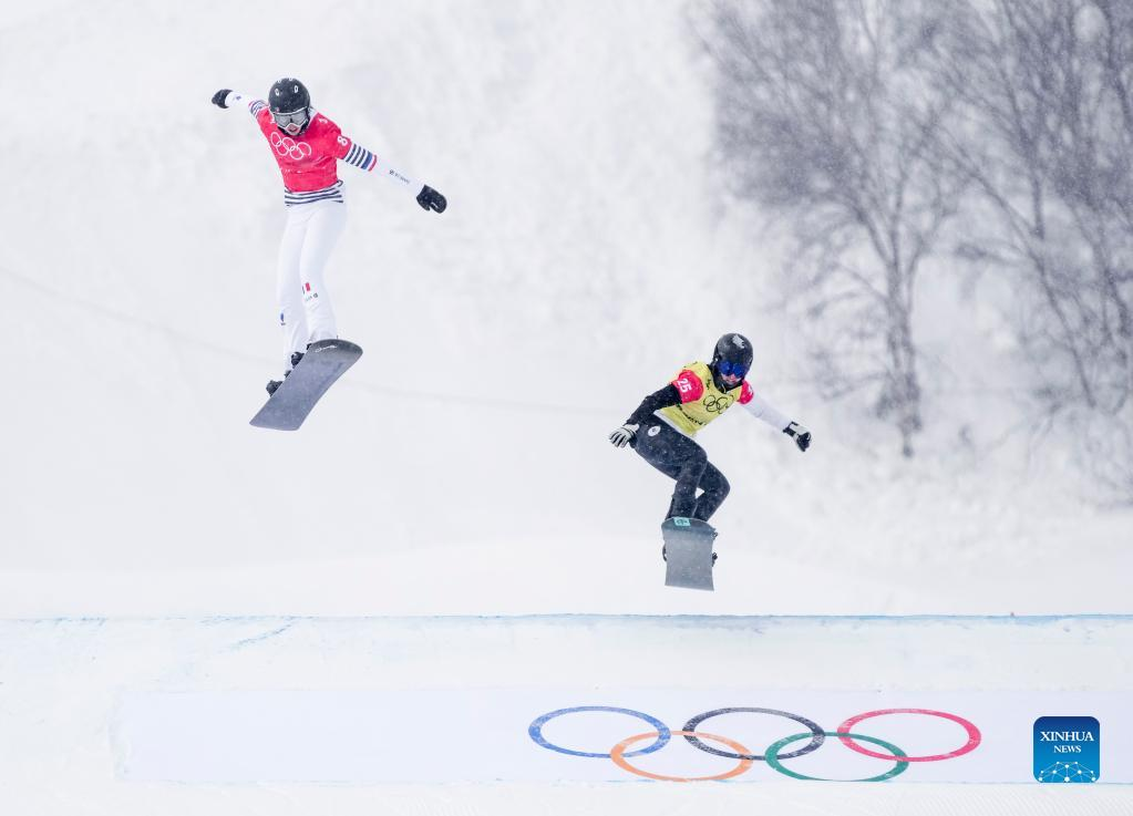 Chloe Trespeuch of France (L) and Mariia Vasiltcova of ROC compete during women's snowboard cross 1/8 finals of the Beijing 2022 Winter Olympics at Genting Snow Park in Zhangjiakou, north China's Hebei Province, Feb. 9, 2022. (Xinhua/Wang Haofei)