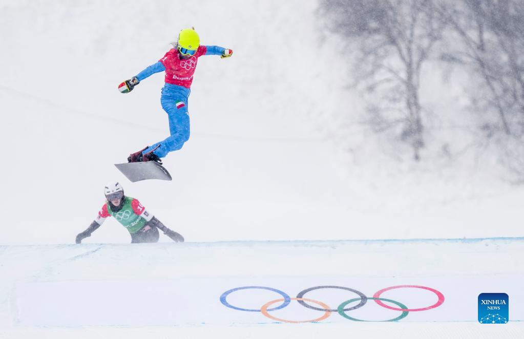 Michela Moioli of Italy (top) and Meghan Tierney of the United States compete during women's snowboard cross 1/8 finals of the Beijing 2022 Winter Olympics at Genting Snow Park in Zhangjiakou, north China's Hebei Province, Feb. 9, 2022. (Xinhua/Wang Haofei)