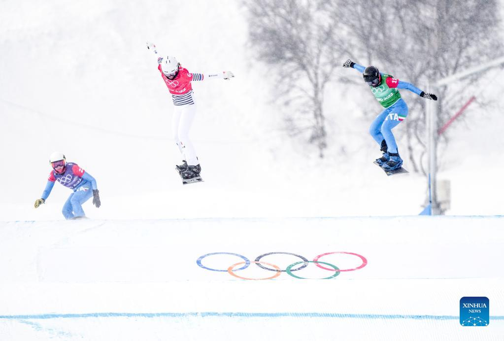 Julia Pereira de Sousa Mabileau of France (C), Caterina Carpano of Italy (R) and Francesca Gallina of Italy compete during women's snowboard cross 1/8 finals of the Beijing 2022 Winter Olympics at Genting Snow Park in Zhangjiakou, north China's Hebei Province, Feb. 9, 2022. (Xinhua/Wang Haofei)