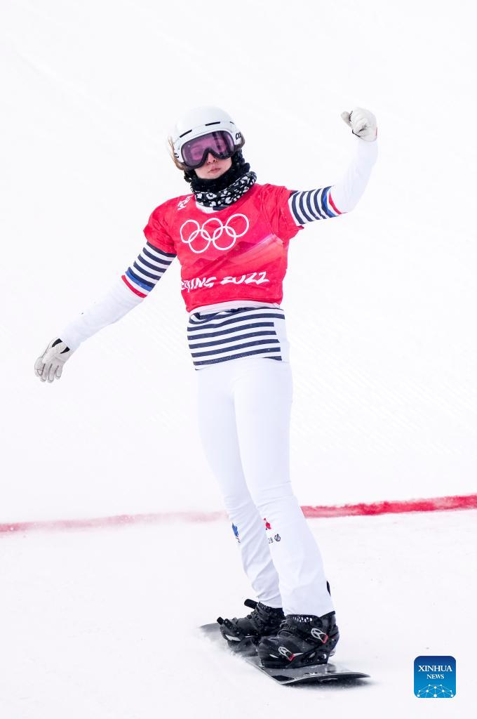 Julia Pereira de Sousa Mabileau of France reacts during women's snowboard cross 1/8 finals of the Beijing 2022 Winter Olympics at Genting Snow Park in Zhangjiakou, north China's Hebei Province, Feb. 9, 2022. (Xinhua/Wang Haofei)