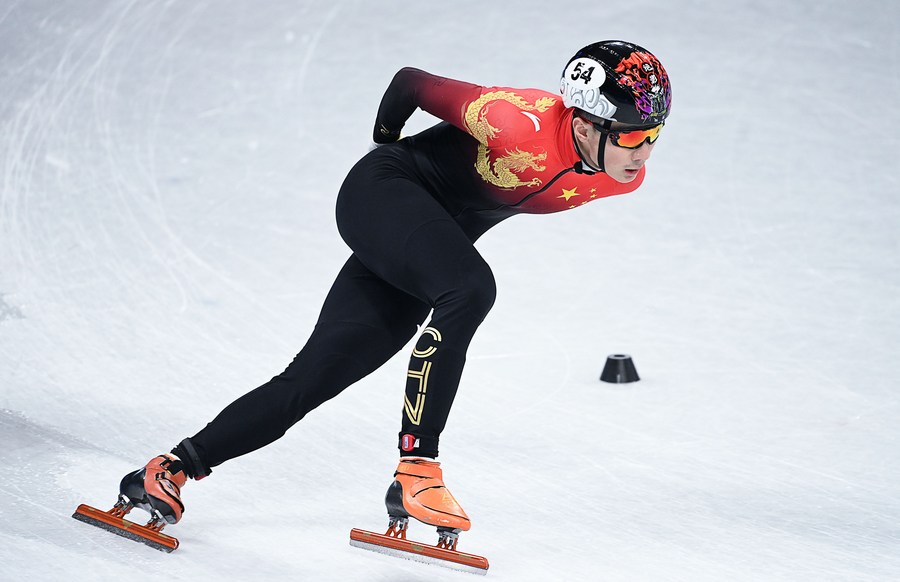 Ren Ziwei of China competes during the men's 1,500m quarterfinal of short track speed skating at Capital Indoor Stadium in Beijing on Feb. 9, 2022. (Xinhua/Xiong Qi)