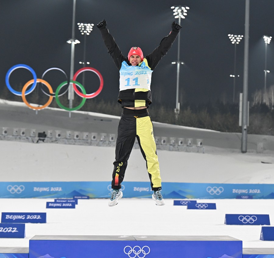 Vinzenz Geiger of Germany celebrates after Nordic combined individual Gundersen normal hill/10km, cross-country at the National Cross-Country Skiing Center in Zhangjiakou, north China's Hebei Province on Feb. 9, 2022. (Xinhua/Zhu Zheng)