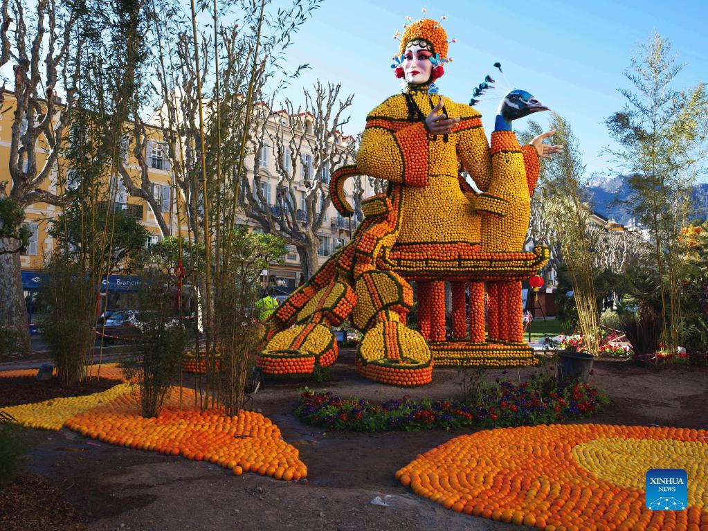 An installation decorated with lemons and oranges is seen during preparations for the annual Lemon Festival in Menton, France, on Feb. 9, 2022. The 2022 Menton Lemon Festival will be held from Feb. 12 to Feb. 27. (Photo by Serge Haouzi/Xinhua)