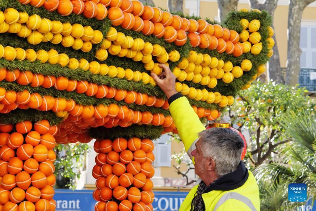 A man decorates an installation during preparations for the annual Lemon Festival in Menton, France, on Feb. 9, 2022. The 2022 Menton Lemon Festival will be held from Feb. 12 to Feb. 27. (Photo by Serge Haouzi/Xinhua)