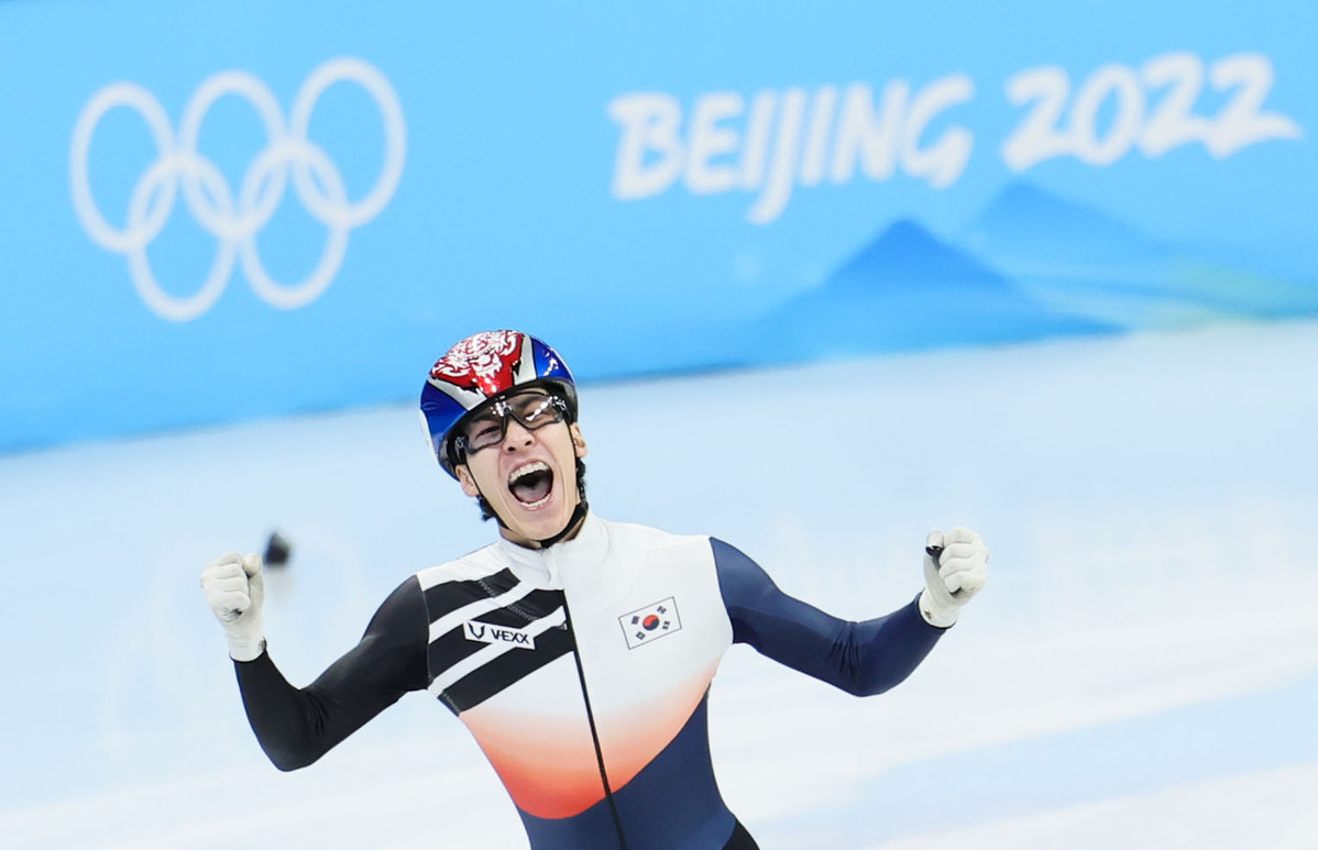 Hwang Dae-heon from South Korea celebrates on Wednesday after winning the men's 1,500m short-track speedskating at the Beijing 2022 Winter Olympics. (LAN HONGGUANG/XINHUA)