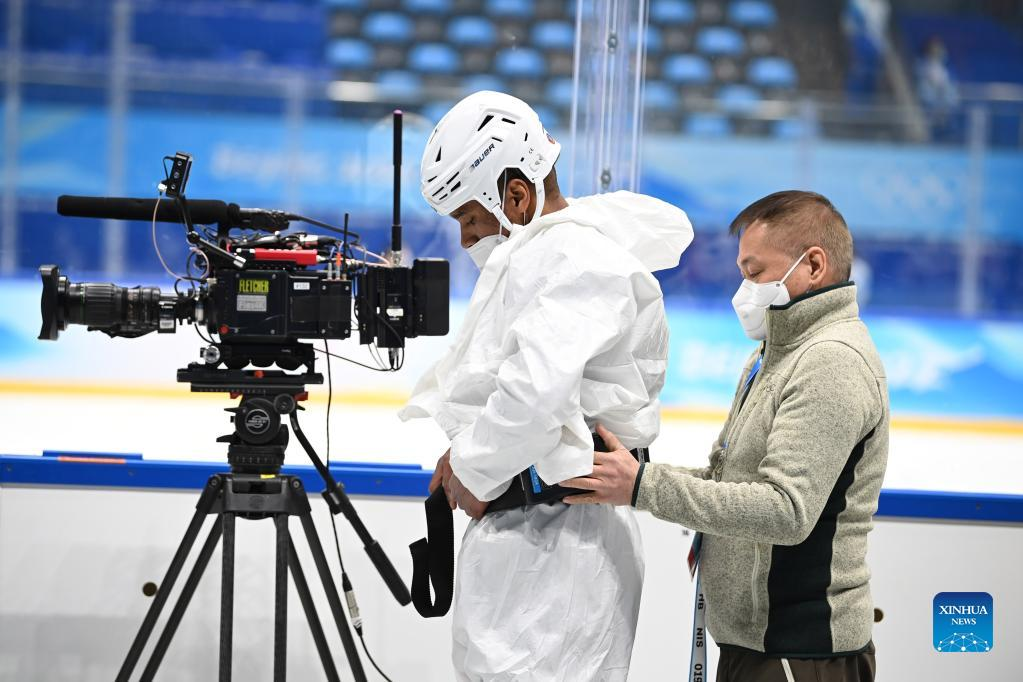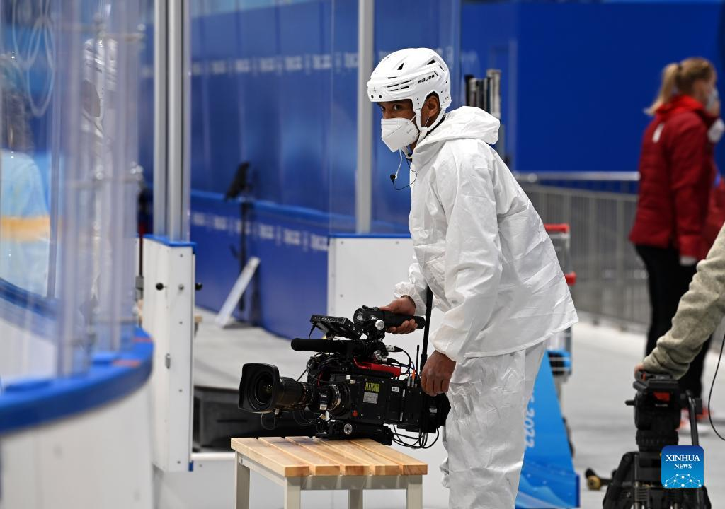 Brennan Mugala gets himself ready for infield shooting on the ice rink at National Indoor Stadium during the Beijing 2022 Olympic Winter Games in Beijing, capital of China, Feb. 8, 2022. The 40-year-old Brennan Mugala from Canada is an infield cameraman of Olympic Broadcasting Services (OBS) covering ice hockey events at National Indoor Stadium in Beijing. Unlike all the other cameramen and photographers in the stadium, Mugala needs to work in a pair of skates as he needs to enter the ice rink for infield shooting before and after the game, so as to bring up-close images of the athletes to the TV audience. In his ten years of work, Mugala has served the Olympic Games for three times. This year's Winter Olympics, however, is the busiest among his Olympic working experiences. In the Beijing 2022 Winter Olympics, he is responsible for controlling both the hand-held camera and the wireless camera. Mugala also needs to cooperate with his colleagues at all times to ensure the smooth broadcasting of each game. Speaking of the facilities and services of the Beijing 2022 Winter Olympics, Mugala said everything provided by the Beijing 2022 Winter Olympics is meticulous and professional. "China has done a great job in the preparatory work, which also sets a good example for other countries in holding large-scale sports event amid the epidemic." This is Mugala's first time to China. "I like Chinese food as well as the Chinese culture very much," said Mugala. "Although I don't have the opportunity to learn more about China under the closed-loop management, I can feel the warmth and friendliness of the Chinese people." When the pandemic is over, "I will definitely bring my family back to Beijing to revisit this familiar yet still-more-to-explore city," said Mugala. (Xinhua/Li Ziheng)