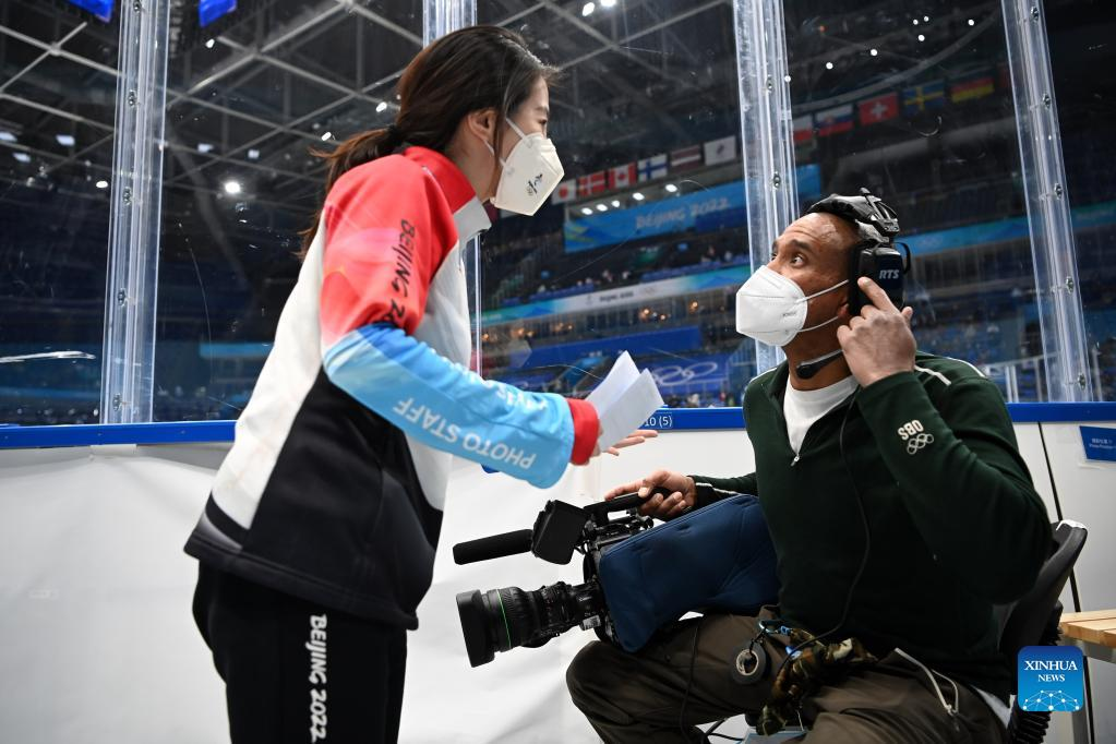 Brennan Mugala (R) communicates with the assistant venue photo manager Chen Ying at National Indoor Stadium during the Beijing 2022 Olympic Winter Games in Beijing, capital of China, Feb. 8, 2022. The 40-year-old Brennan Mugala from Canada is an infield cameraman of Olympic Broadcasting Services (OBS) covering ice hockey events at National Indoor Stadium in Beijing. Unlike all the other cameramen and photographers in the stadium, Mugala needs to work in a pair of skates as he needs to enter the ice rink for infield shooting before and after the game, so as to bring up-close images of the athletes to the TV audience. In his ten years of work, Mugala has served the Olympic Games for three times. This year's Winter Olympics, however, is the busiest among his Olympic working experiences. In the Beijing 2022 Winter Olympics, he is responsible for controlling both the hand-held camera and the wireless camera. Mugala also needs to cooperate with his colleagues at all times to ensure the smooth broadcasting of each game. Speaking of the facilities and services of the Beijing 2022 Winter Olympics, Mugala said everything provided by the Beijing 2022 Winter Olympics is meticulous and professional. "China has done a great job in the preparatory work, which also sets a good example for other countries in holding large-scale sports event amid the epidemic." This is Mugala's first time to China. "I like Chinese food as well as the Chinese culture very much," said Mugala. "Although I don't have the opportunity to learn more about China under the closed-loop management, I can feel the warmth and friendliness of the Chinese people." When the pandemic is over, "I will definitely bring my family back to Beijing to revisit this familiar yet still-more-to-explore city," said Mugala. (Xinhua/Li Ziheng)