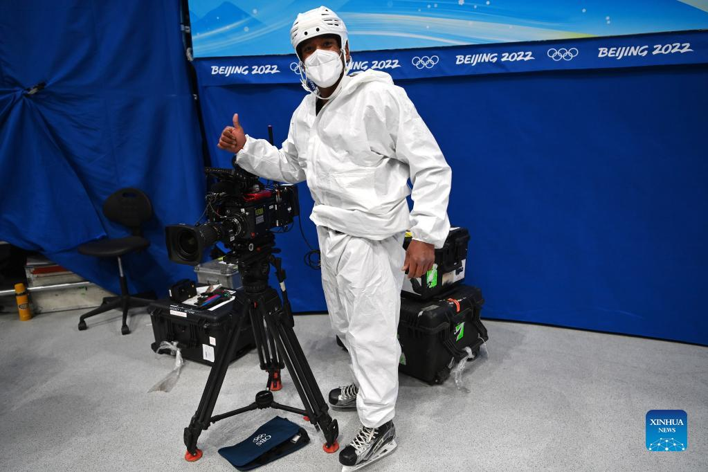 Brennan Mugala gives a thumbs-up sign to the director of broadcasting after getting ready at National Indoor Stadium during the Beijing 2022 Olympic Winter Games in Beijing, capital of China, Feb. 8, 2022. The 40-year-old Brennan Mugala from Canada is an infield cameraman of Olympic Broadcasting Services (OBS) covering ice hockey events at National Indoor Stadium in Beijing. Unlike all the other cameramen and photographers in the stadium, Mugala needs to work in a pair of skates as he needs to enter the ice rink for infield shooting before and after the game, so as to bring up-close images of the athletes to the TV audience. In his ten years of work, Mugala has served the Olympic Games for three times. This year's Winter Olympics, however, is the busiest among his Olympic working experiences. In the Beijing 2022 Winter Olympics, he is responsible for controlling both the hand-held camera and the wireless camera. Mugala also needs to cooperate with his colleagues at all times to ensure the smooth broadcasting of each game. Speaking of the facilities and services of the Beijing 2022 Winter Olympics, Mugala said everything provided by the Beijing 2022 Winter Olympics is meticulous and professional. "China has done a great job in the preparatory work, which also sets a good example for other countries in holding large-scale sports event amid the epidemic." This is Mugala's first time to China. "I like Chinese food as well as the Chinese culture very much," said Mugala. "Although I don't have the opportunity to learn more about China under the closed-loop management, I can feel the warmth and friendliness of the Chinese people." When the pandemic is over, "I will definitely bring my family back to Beijing to revisit this familiar yet still-more-to-explore city," said Mugala. (Xinhua/Li Ziheng)