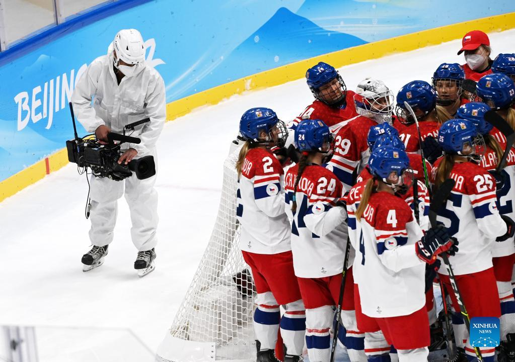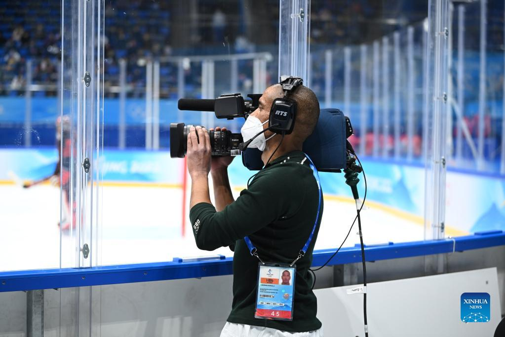 Brennan Mugala shoots with a video camera in his skates on the ice rink at National Indoor Stadium during the Beijing 2022 Olympic Winter Games in Beijing, capital of China, Feb. 8, 2022. The 40-year-old Brennan Mugala from Canada is an infield cameraman of Olympic Broadcasting Services (OBS) covering ice hockey events at National Indoor Stadium in Beijing. Unlike all the other cameramen and photographers in the stadium, Mugala needs to work in a pair of skates as he needs to enter the ice rink for infield shooting before and after the game, so as to bring up-close images of the athletes to the TV audience. In his ten years of work, Mugala has served the Olympic Games for three times. This year's Winter Olympics, however, is the busiest among his Olympic working experiences. In the Beijing 2022 Winter Olympics, he is responsible for controlling both the hand-held camera and the wireless camera. Mugala also needs to cooperate with his colleagues at all times to ensure the smooth broadcasting of each game. Speaking of the facilities and services of the Beijing 2022 Winter Olympics, Mugala said everything provided by the Beijing 2022 Winter Olympics is meticulous and professional. "China has done a great job in the preparatory work, which also sets a good example for other countries in holding large-scale sports event amid the epidemic." This is Mugala's first time to China. "I like Chinese food as well as the Chinese culture very much," said Mugala. "Although I don't have the opportunity to learn more about China under the closed-loop management, I can feel the warmth and friendliness of the Chinese people." When the pandemic is over, "I will definitely bring my family back to Beijing to revisit this familiar yet still-more-to-explore city," said Mugala. (Xinhua/Li Ziheng)