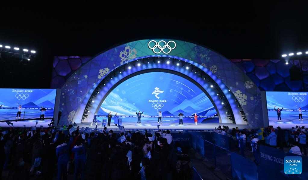 Medalists celebrate during the awarding ceremony of men's freeski big air at the Beijing Medals Plaza of the Winter Olympics in Beijing, capital of China, Feb. 9, 2022. (Xinhua/Huang Zongzhi)